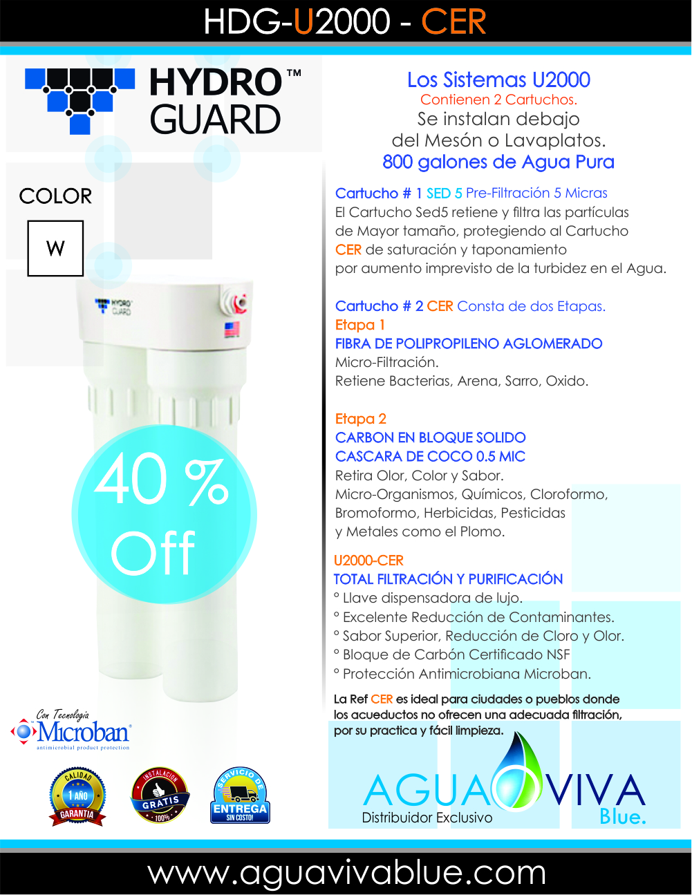 Hydro Guard™ U2000-CER Por su fácil limpieza, nuestro filtro CER es recomendado para ciudades o poblaciones donde el agua potable llega con mayor turbiedad o solidos suspendidos en el Agua. Incorpora dos cartuchos. Un Primer cartucho de Filtración y protección que retiene partículas hasta de 5 micras, que impiden que el segundo cartucho de Purificación se ensucie fácilmente. Un segundo cartucho de filtración gradual de Agua en dos pasos que filtra y Purifica.