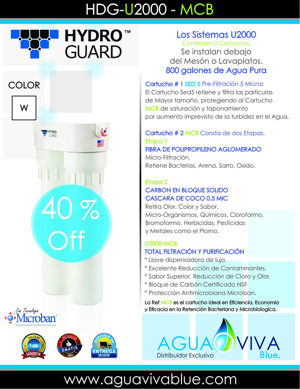 The Hydro Guard™ U2000-MCB Incorpora dos cartuchos. Un Primer cartucho de Filtración y protección que retiene partículas hasta de 5 micras, que impide que el segundo cartucho de Purificación se ensucie fácilmente. Un segundo cartucho de filtración gradual de Agua en dos pasos que filtra y Purifica.