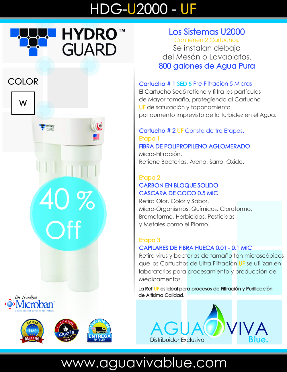 Hydro Guard™ U2000-UF Incorpora dos cartuchos. Un Primer cartucho de Filtración y protección que retiene partículas hasta de 5 micras, que impide que el segundo cartucho de Purificación se ensucie fácilmente. El Hydro Guard U2000-UF Incorpora un cartucho de filtración de agua de tres pasos.